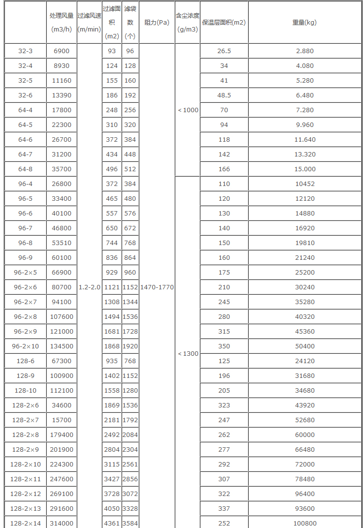本系列產(chǎn)品共有33種規(guī)格,每室的袋有32、64、96、128袋四種,濾袋長度有2450mm和3060mm兩種,收塵效率可達99.9%以上,凈化后氣體的含塵濃度小于50mg/m3(標)本系列收塵器如用于寒冷地區(qū),當室外采暖計算溫度≤-25℃時,要設熱裝置。